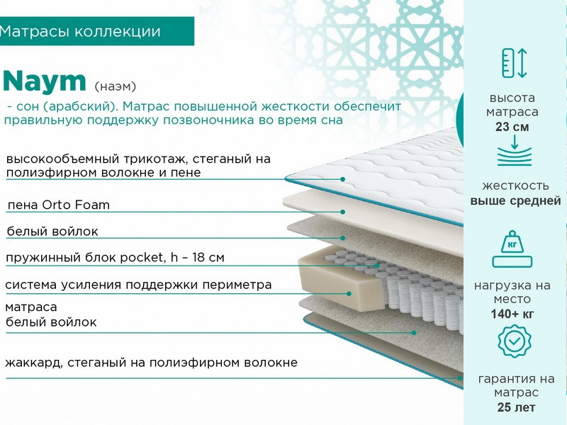 Несъемный чехол верх — объемный трикотаж, стеганный на полиэфирном волокне и пене Orto Foam, нижняя часть — жаккард, стеганный на полиэфирном волокне.