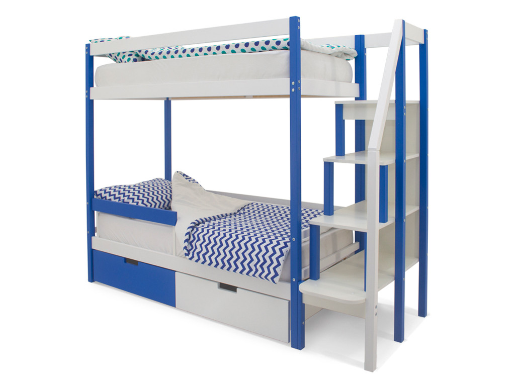 Двухъярусная кровать Svogen с ящиками и бортиком сине-белый