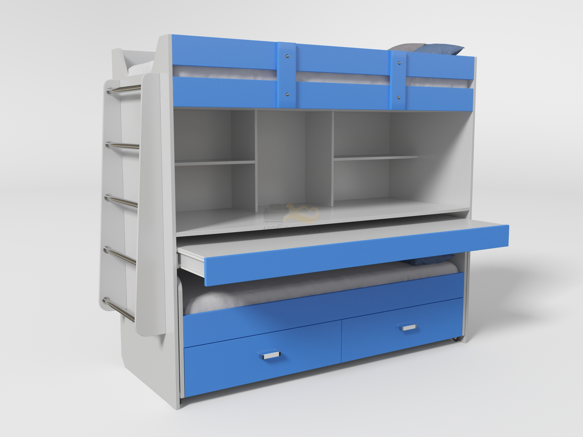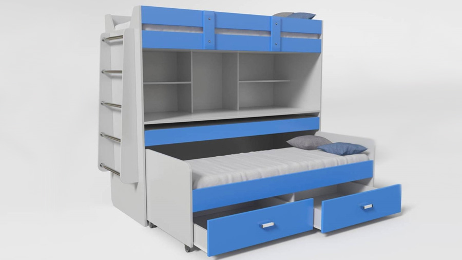Эта двухъярусная кровать – настоящая находка для небольших комнат. Выдвижная столешница на усиленных направляющих полного выдвижения формирует большой полноценный учебный стол для двоих детей, при этом все учебники и письменные принадлежности остаются на полках.