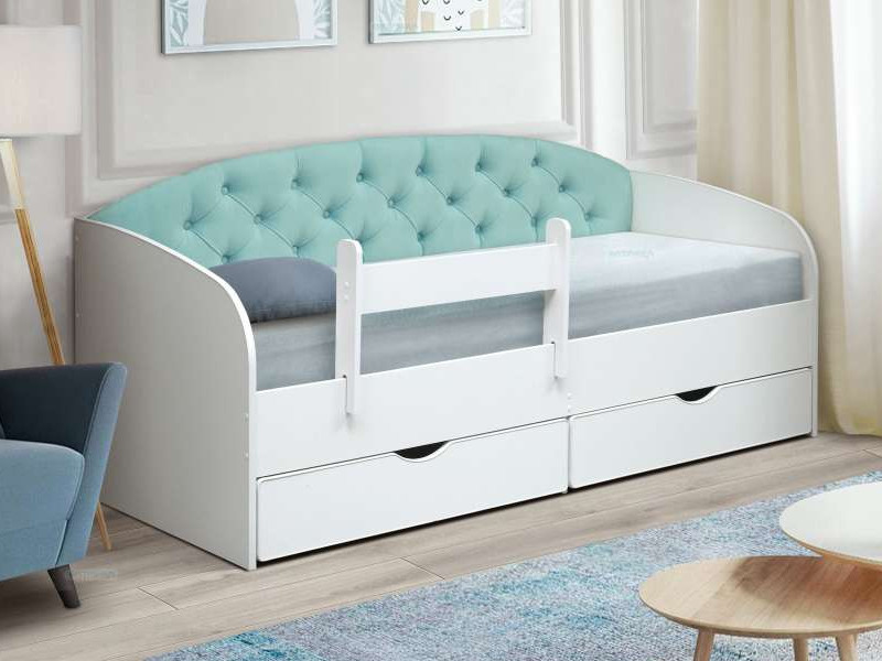 - Кровать с мягкой спинкой Софа №9 бирюза с бортиком 800х1900
