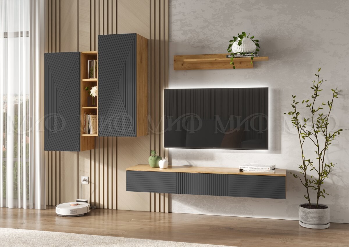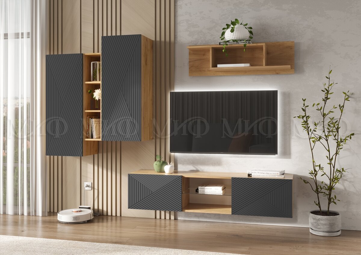 Гостиная навесная Флэш Браш Графит, Дуб Крафт