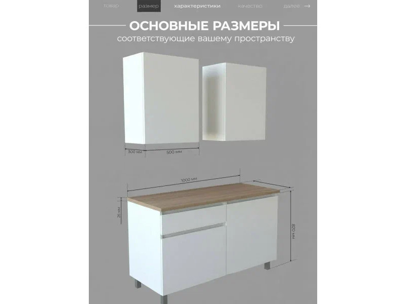 Высота нижних модулей с учетом столешницы и опор составляет 850 мм, глубина модулей - 500 мм.