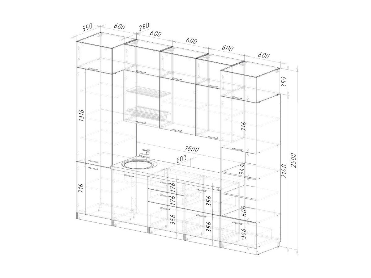 Мойка, смеситель, стеновая панель и посудосушитель в комплект гарнитура не входят.