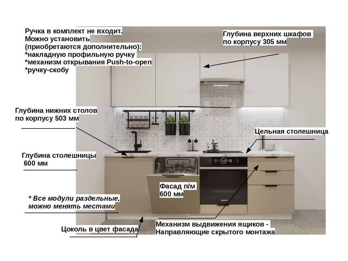 Кухонная мойка, стеновая панель, посудосушитель, планки для столешницы в комплект не входят.