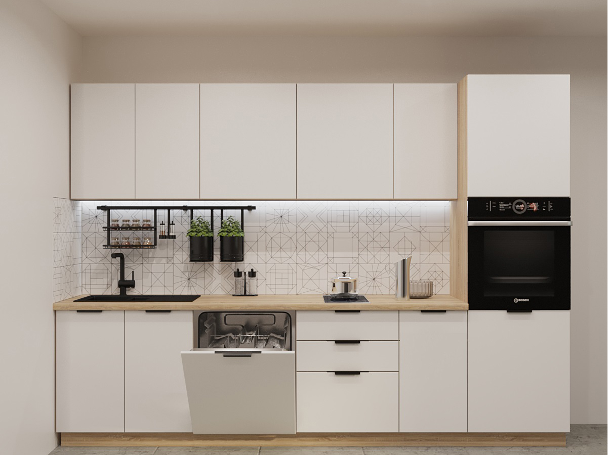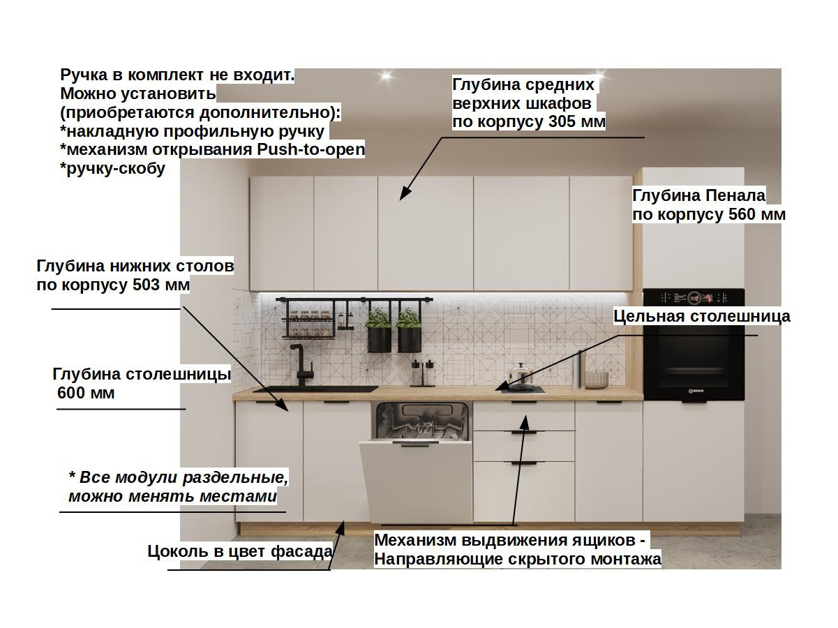 Кухонная мойка, стеновая панель, посудосушитель, планки для столешницы в комплект не входят.