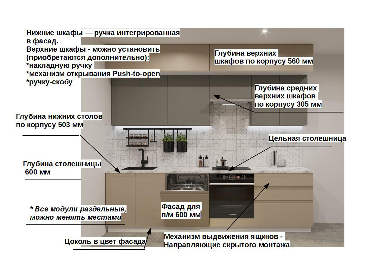 Кухонная мойка, стеновая панель, посудосушитель, планки для столешницы в комплект не входят.