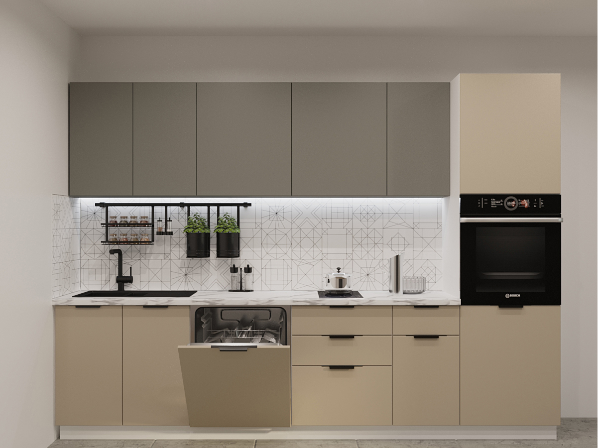 Кухонная мойка, стеновая панель, посудосушитель, планки для столешницы в комплект не входят.