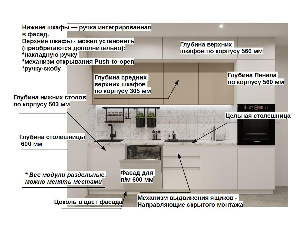 Кухонная мойка, стеновая панель, посудосушитель, планки для столешницы в комплект не входят.