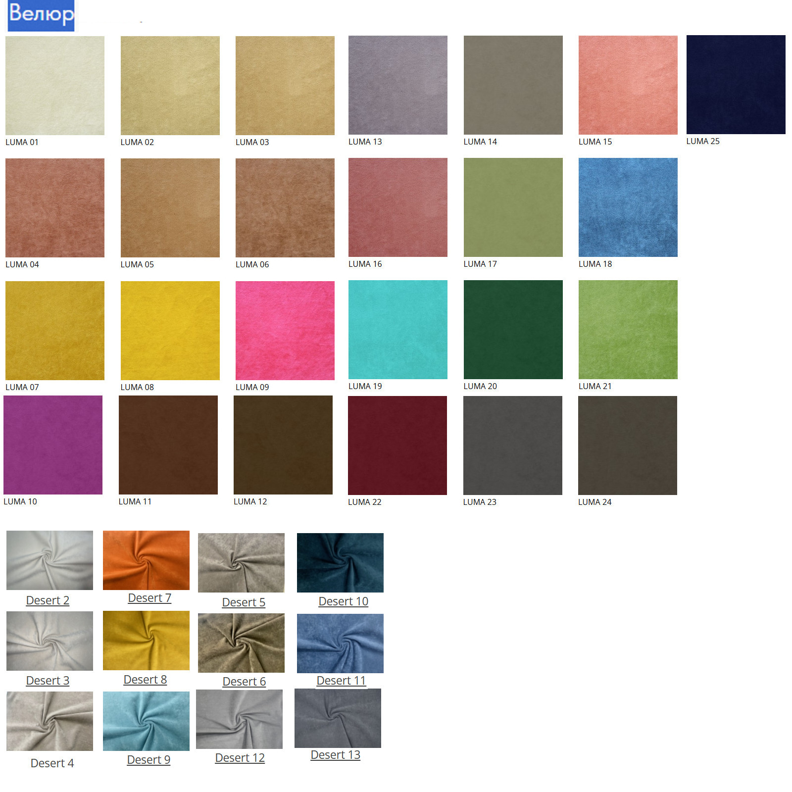 - Кольт, Luma, Paris, Merlin, Desert, Plush, Jercy, Dubai