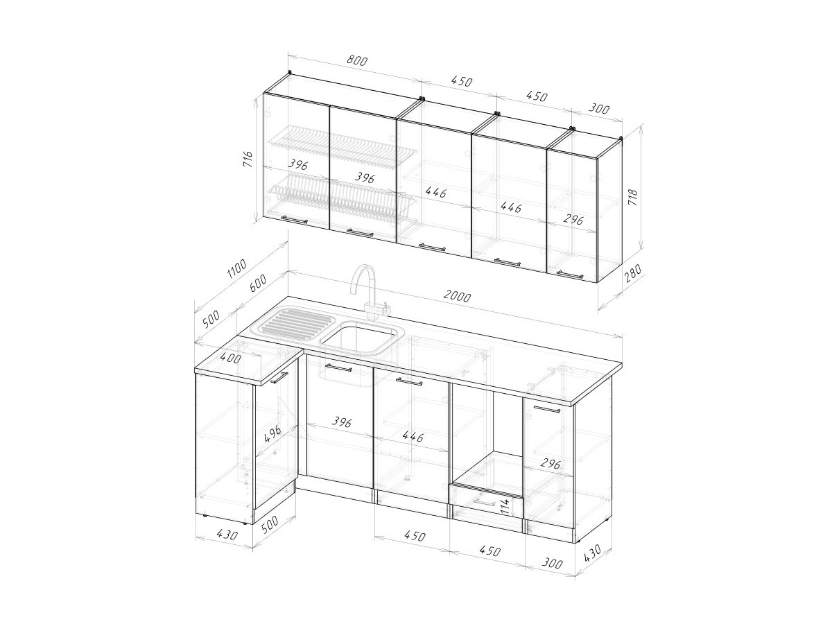 Мойка, смеситель, стеновая панель и посудосушитель в комплект гарнитура не входят.