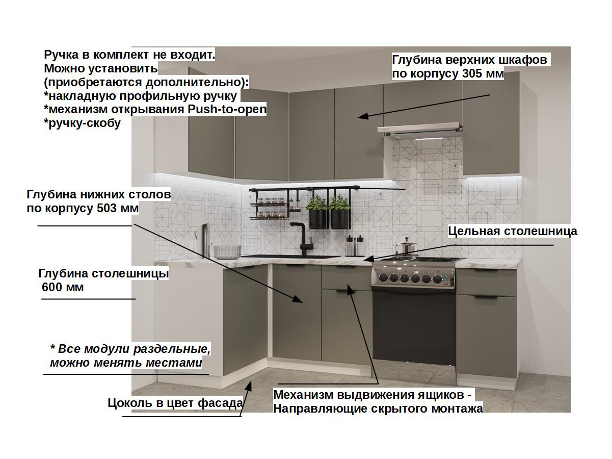 Кухонная мойка, стеновая панель, посудосушитель, планки для столешницы в комплект не входят.