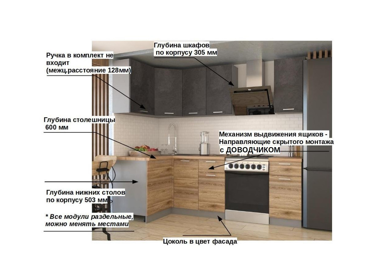 Кухонная мойка, стеновая панель, посудосушитель, планки для столешницы в комплект не входят.