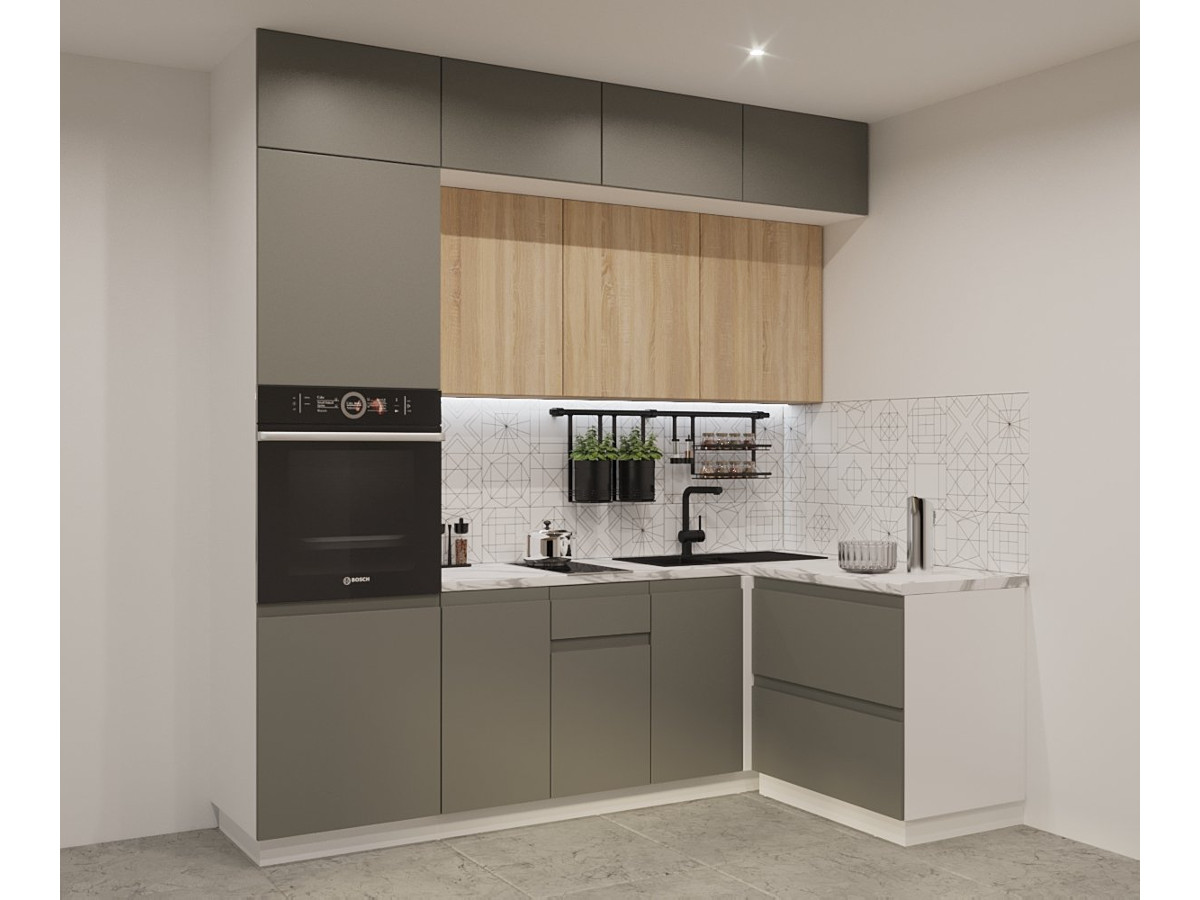 - Кухонный гарнитур арт 18 Лайн Обсидиан Дуб сонома 2400х1400 мм