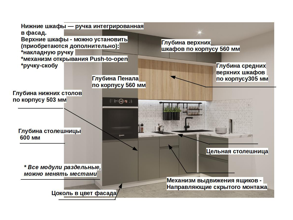 Кухонная мойка, стеновая панель, посудосушитель, планки для столешницы в комплект не входят.