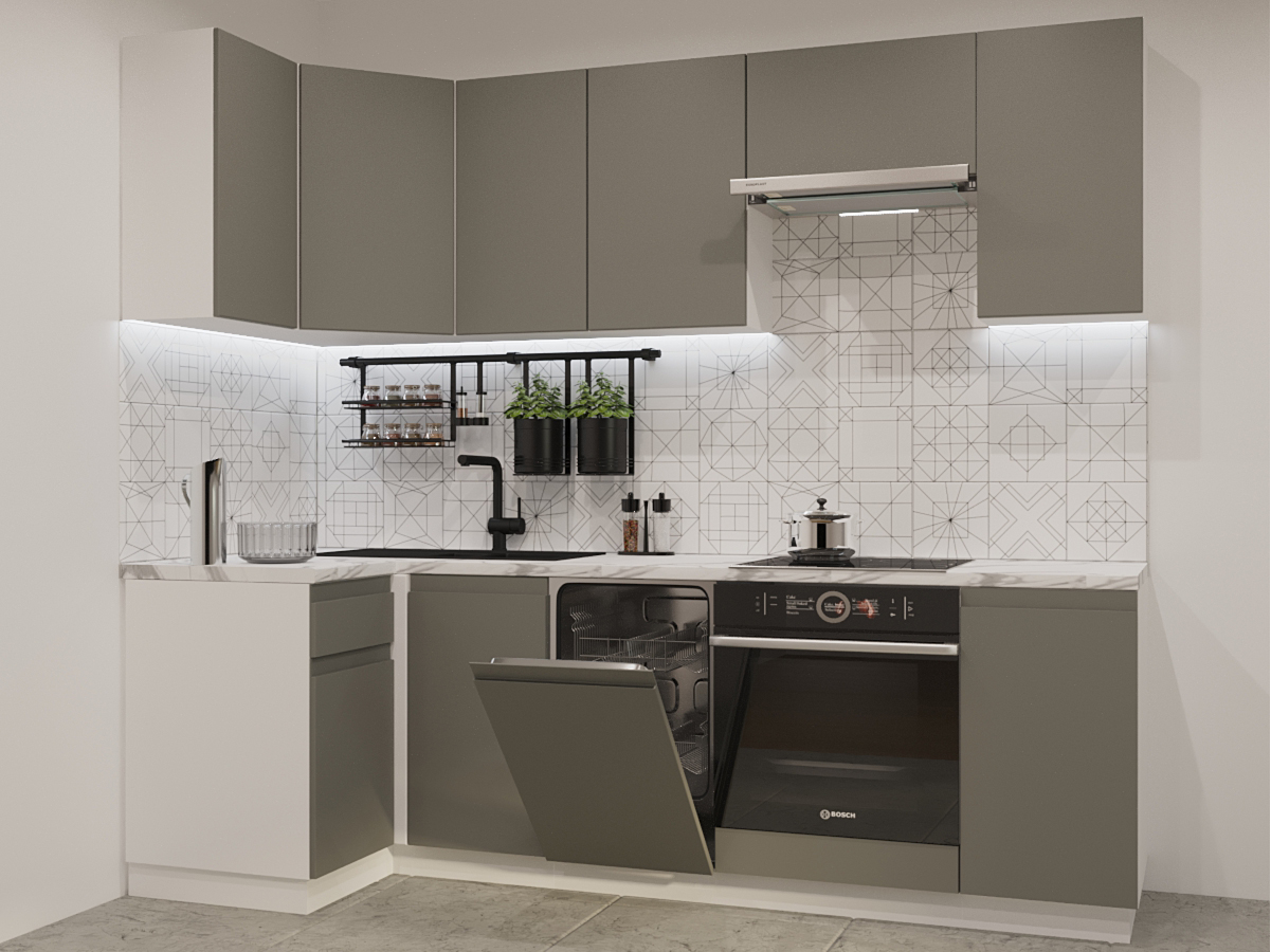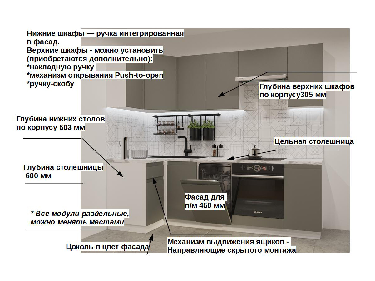 Кухонная мойка, стеновая панель, посудосушитель, планки для столешницы в комплект не входят.