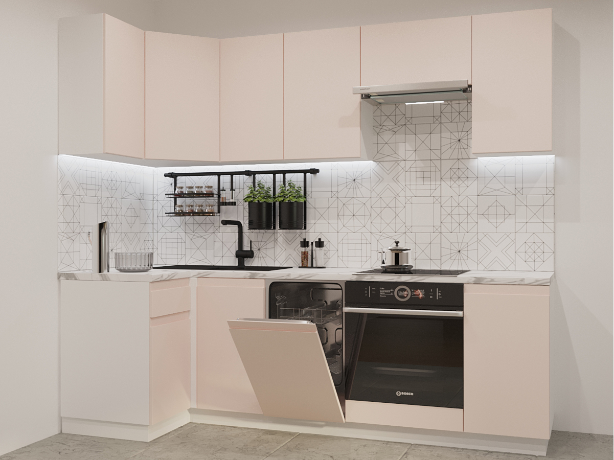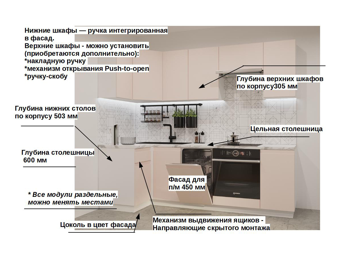 Кухонная мойка, стеновая панель, посудосушитель, планки для столешницы в комплект не входят.