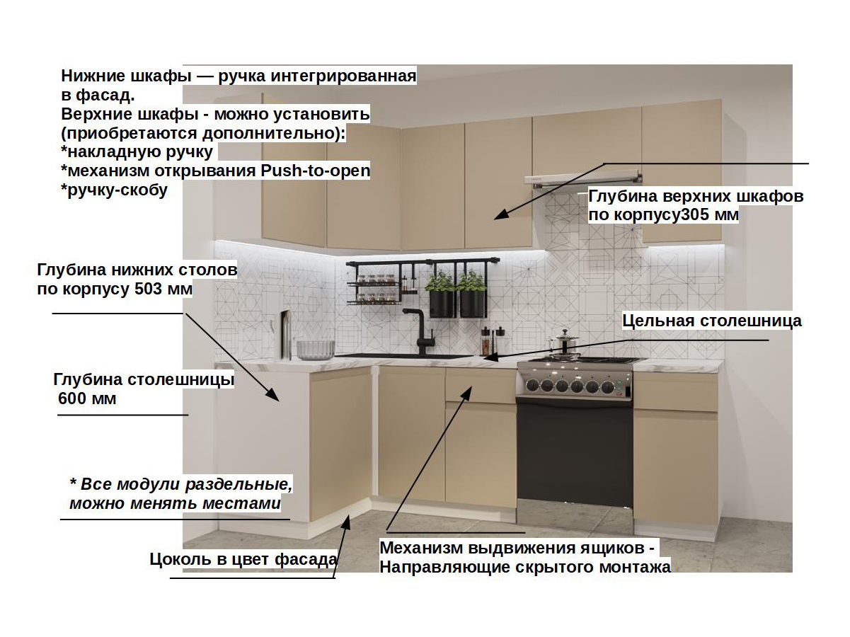Кухонная мойка, стеновая панель, посудосушитель, планки для столешницы в комплект не входят.