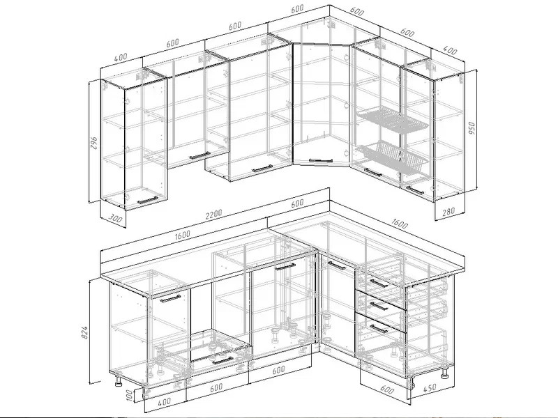 Ширина кухни: 2200х1600 мм