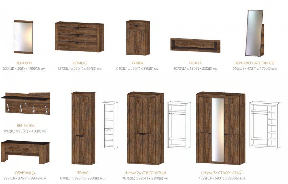 Цена указана за комплектацию на фото: Зеркало, Тумба, Вешалка, Обувница, Шкаф 2-х створчатый