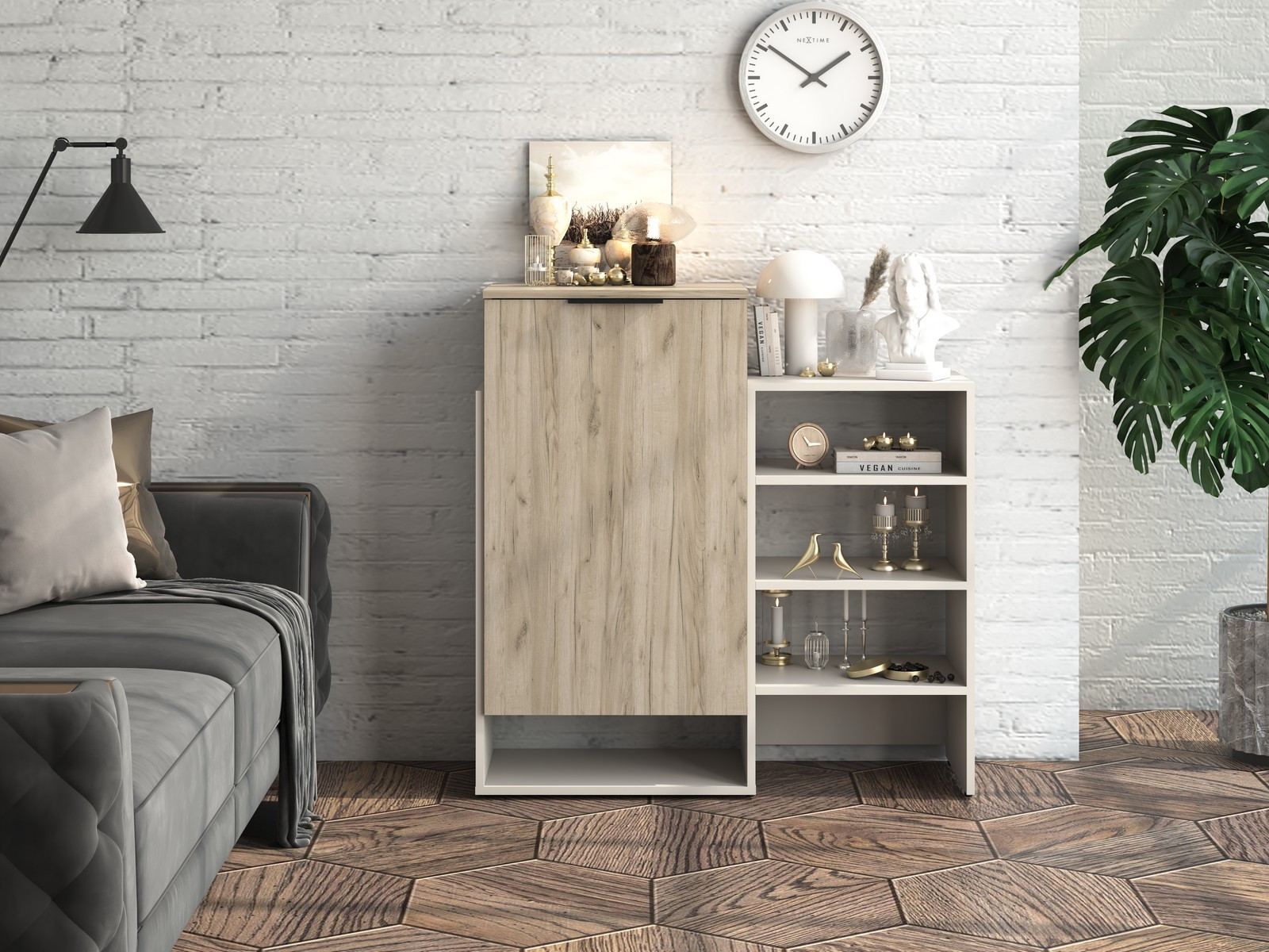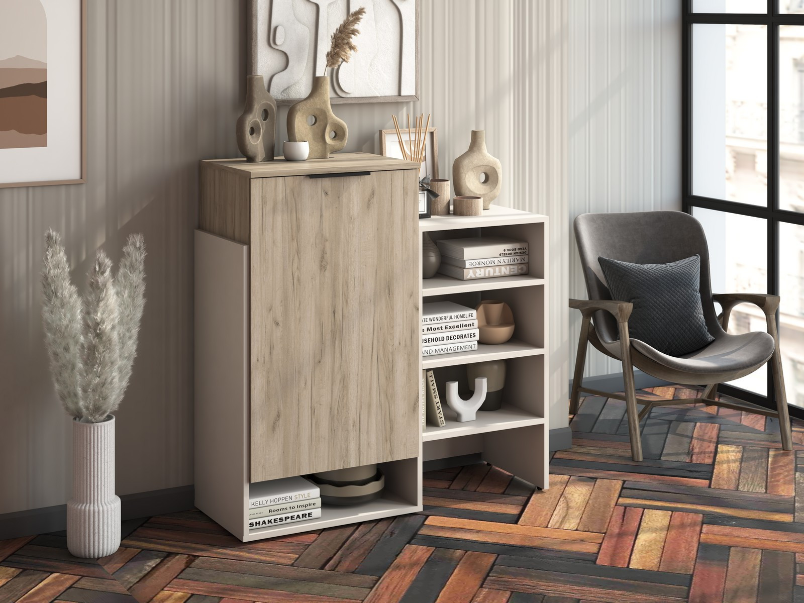 Тумба-комод ТМ-001может использоваться как комод или как обувница путем установки полок в горизонтальном или наклонном положении в закрытом парящем модуле.