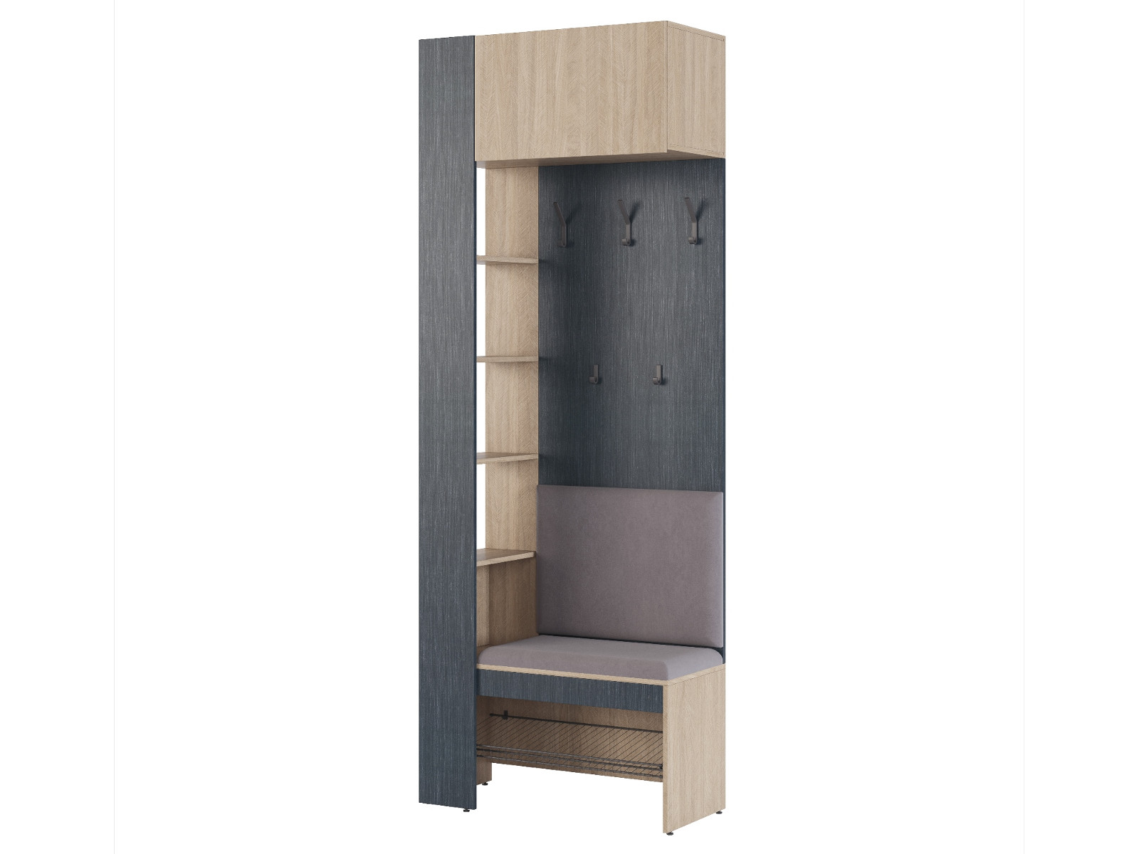 - Все основные элементы сделаны из ЛДСП, с имитирующим древесную текстуру декором. Отдельные вставки — серого графитового цвета. Банкетка обита стойким к истиранию текстилем.
