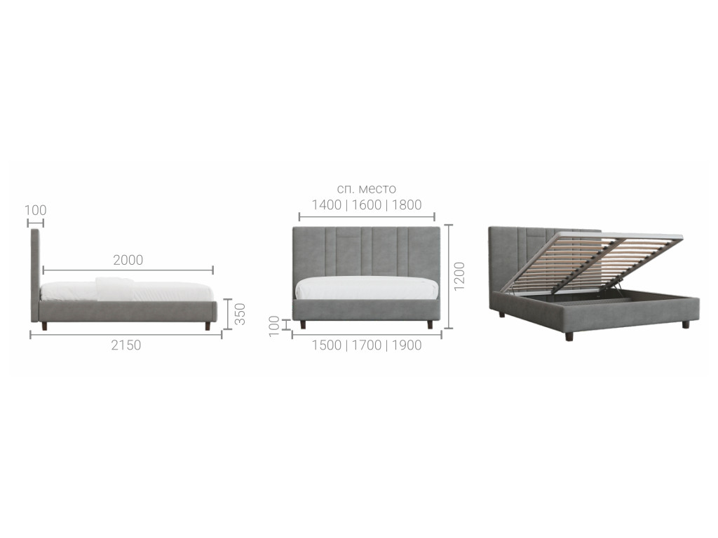 Кровать имеет подъемное ортопедическое основание и короб с дном из МДФ.