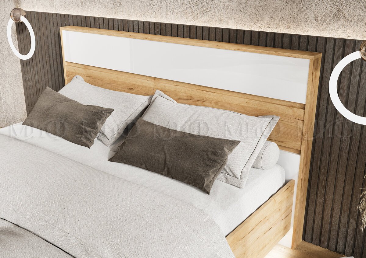 - Кровать парящая 1600 Роджина (с ПМ) Белый глянец холодный/Дуб Крафт