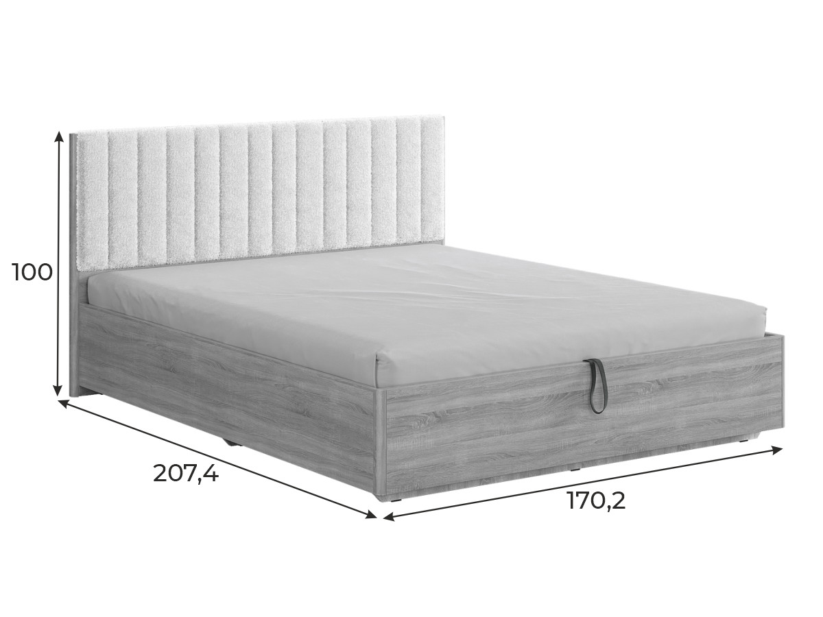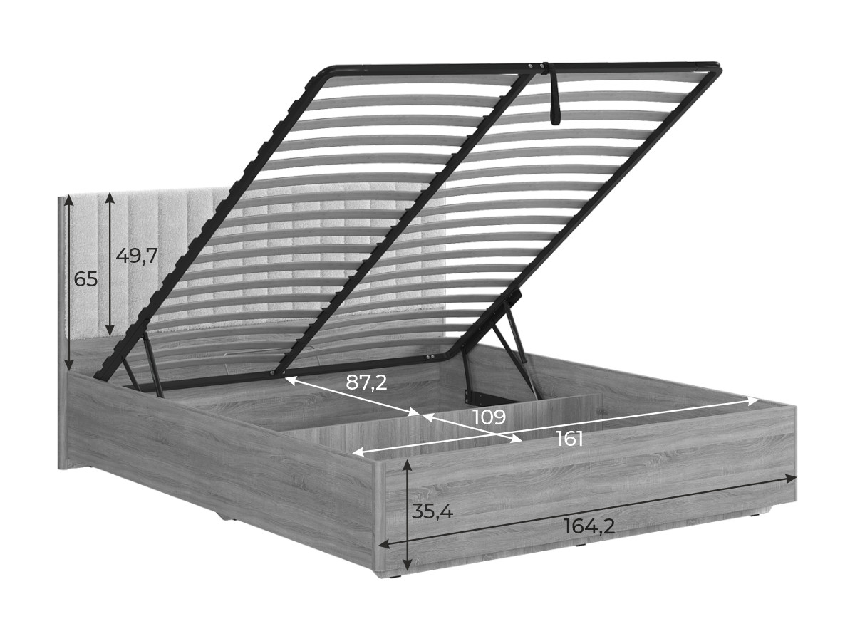 Состоит из: изголовья с мягким элементом, каркаса из ЛДСП и места спального с подъемным основанием..