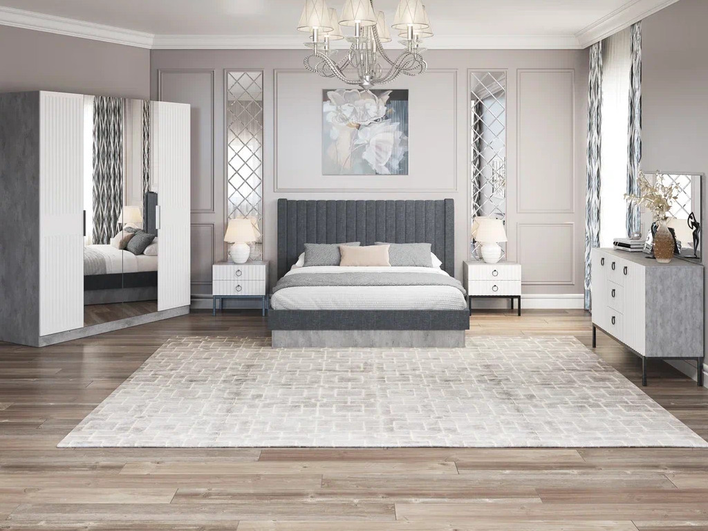 Цена за комплект: Каркас шкафа 4 дв, Двери глухие (2шт), Двери с зеркалом (2 шт), Кровать (1600) с ПМ, Тумба (2шт), Комод, Зеркало