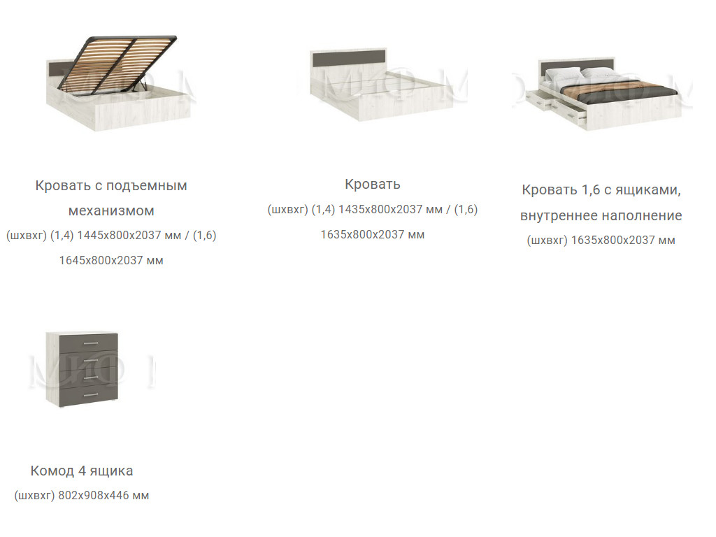 Цена за комплект: Шкаф 3-х створчатый, Кровать 1,6м с ящиками, Комод 3 ящ 2 двери