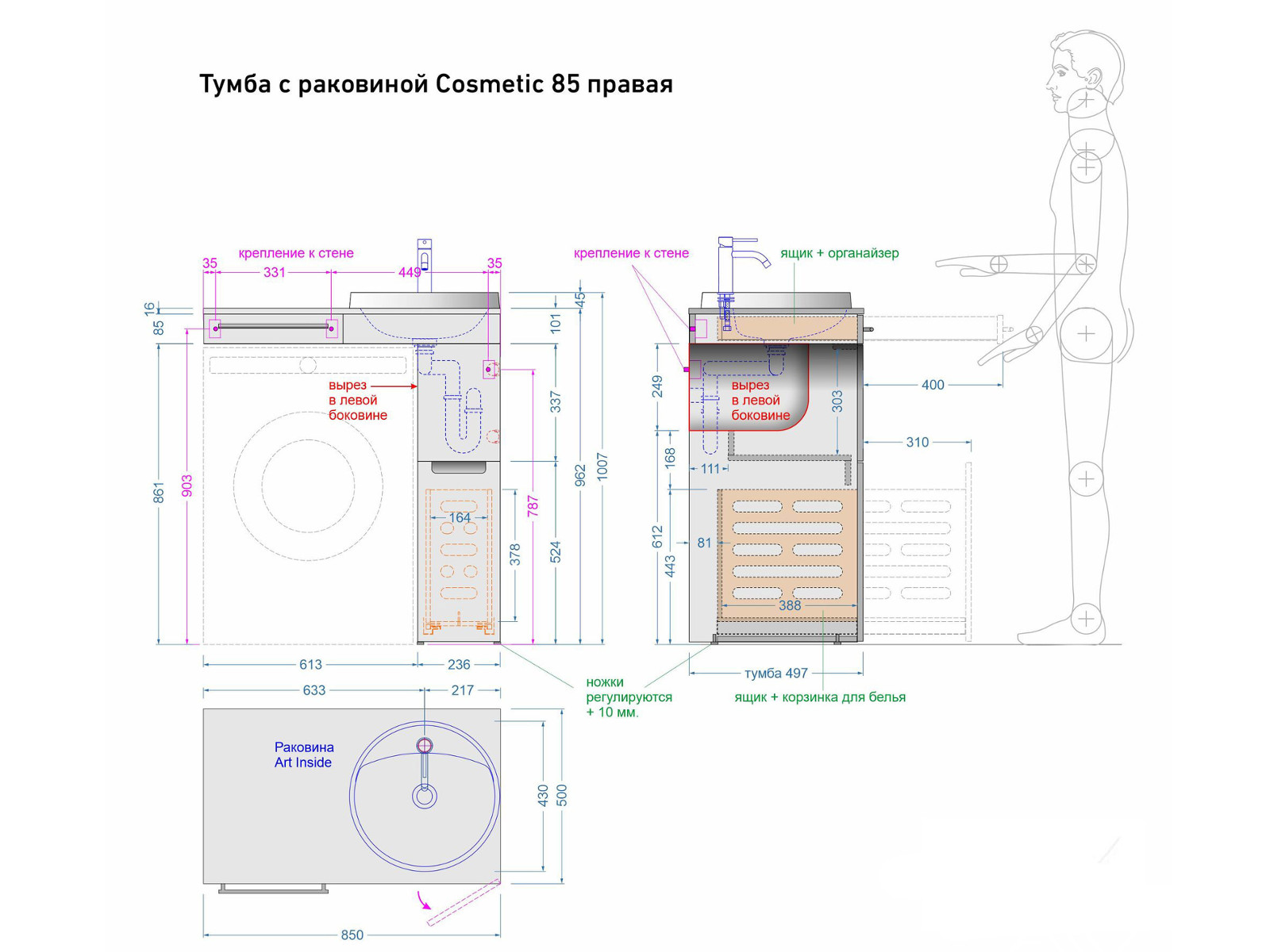 - Тумба с раковиной Cosmetic 85 белая правая