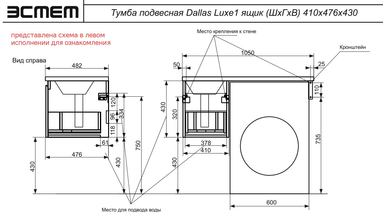 - Тумба с раковиной Dallas Luxe 1050 навесная 1 ящик правая