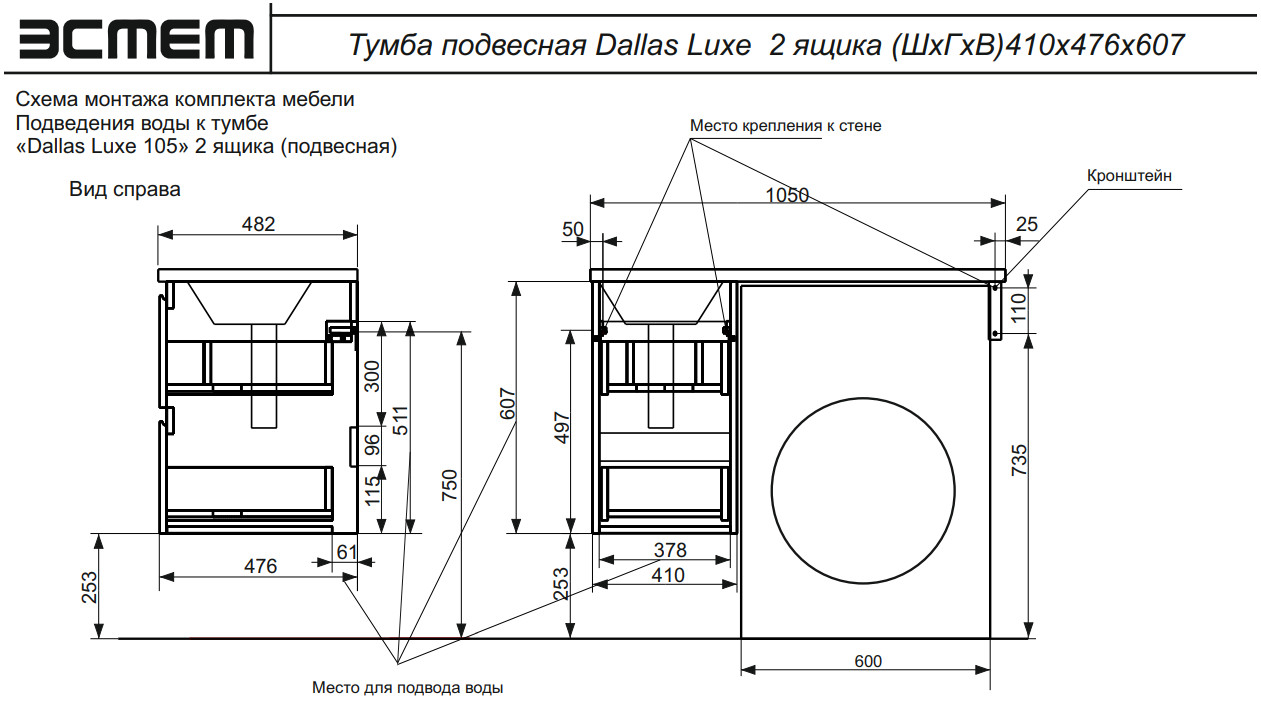 Тумба с раковиной Dallas Luxe 1050 навесная 2 ящика левая