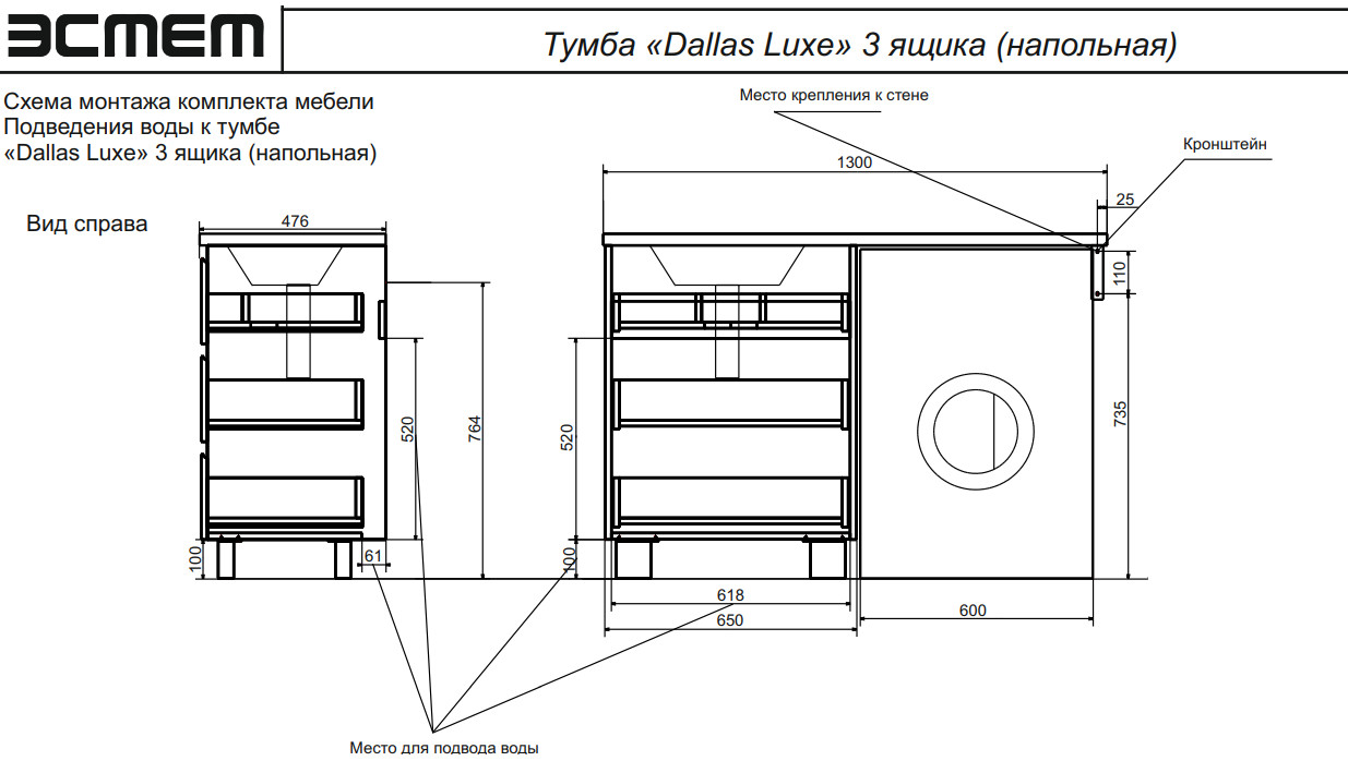 - Тумба с раковиной Dallas Luxe 1300 напольная 3 ящика левая