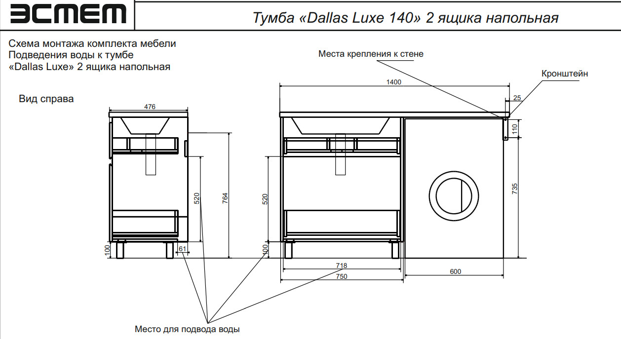 - Тумба с раковиной Dallas Luxe 1400 напольная 2 ящика левая