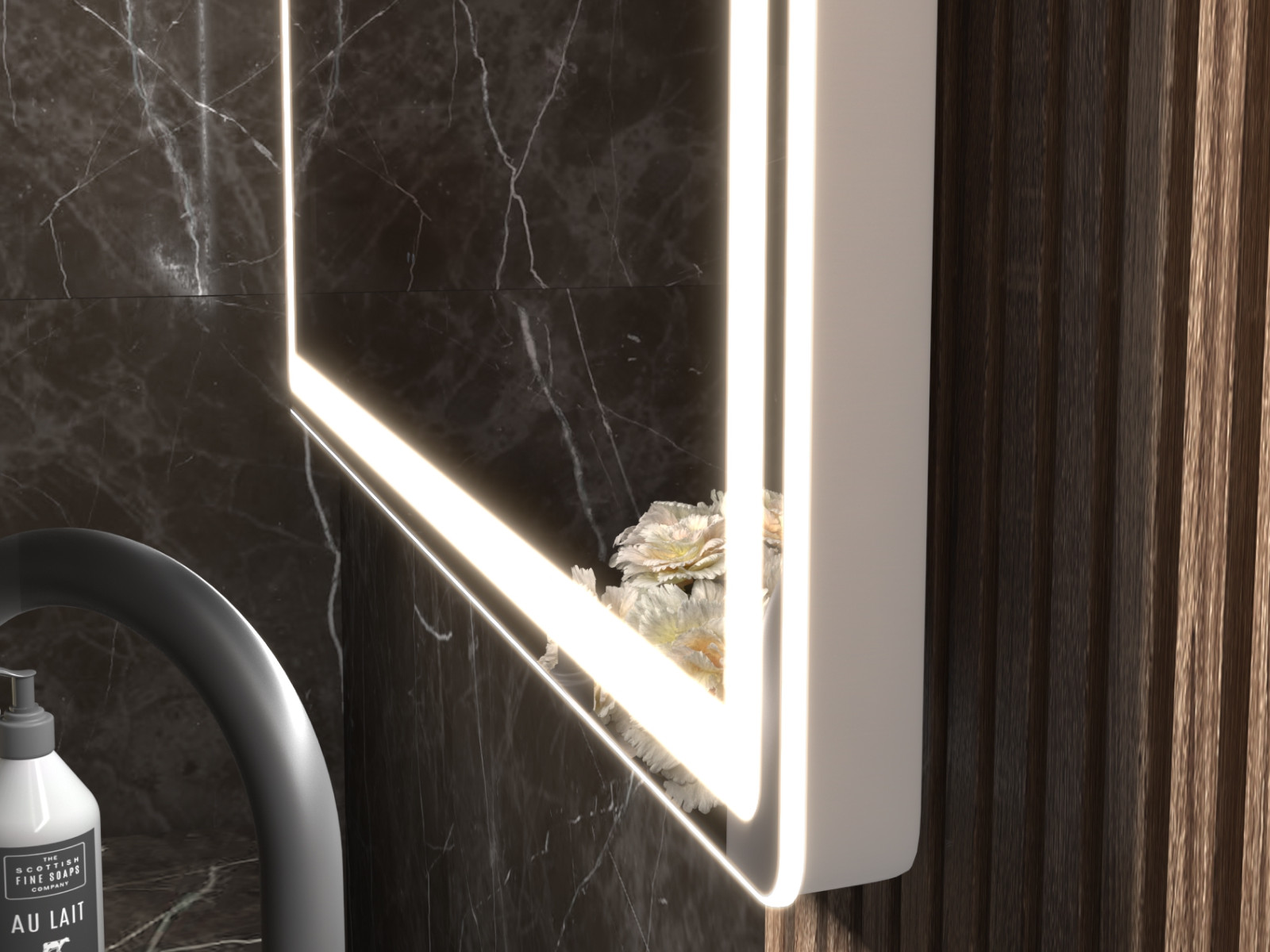 светодиодная подсветка по периметру; сенсорное управление; антизапотевание; включение на взмах