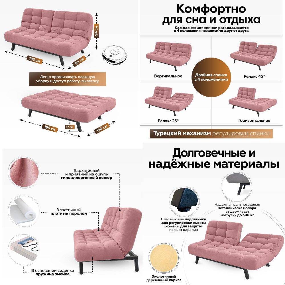 Встроенный механизм «клик кляк» позволяет трансформировать диван в 3 положения: