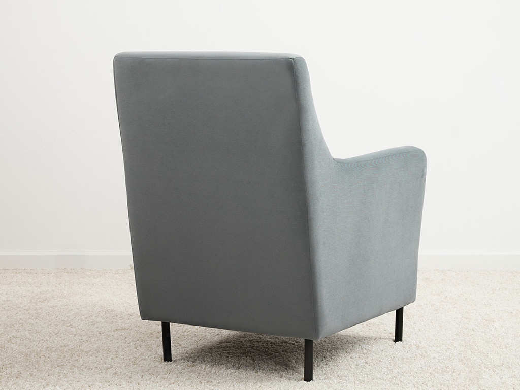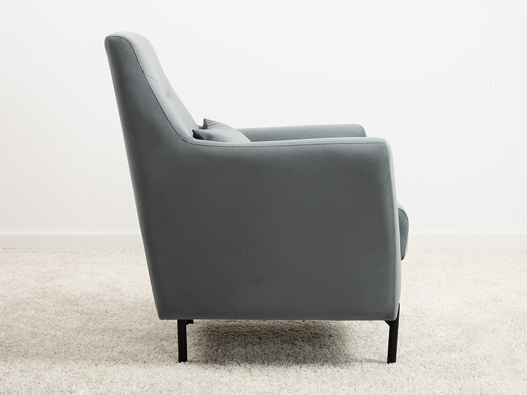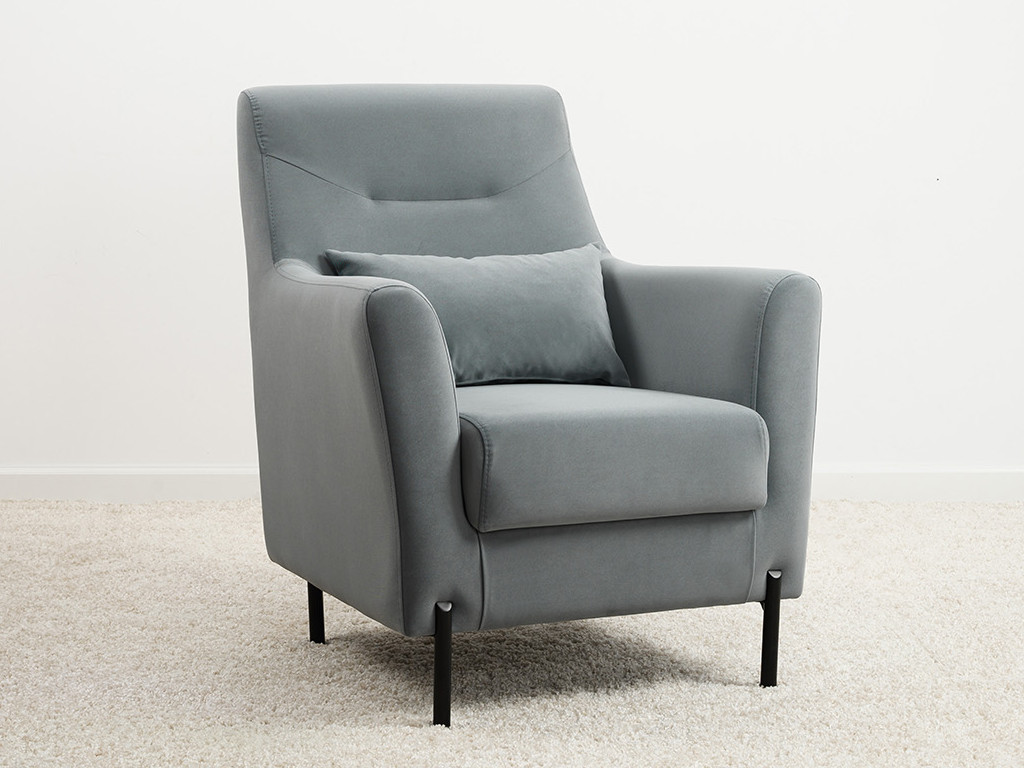 Декоративная утяжка на спинке кресла, декоративная подушка в цвете кресла, металлические опоры переходят в декоративный элемент подлокотника