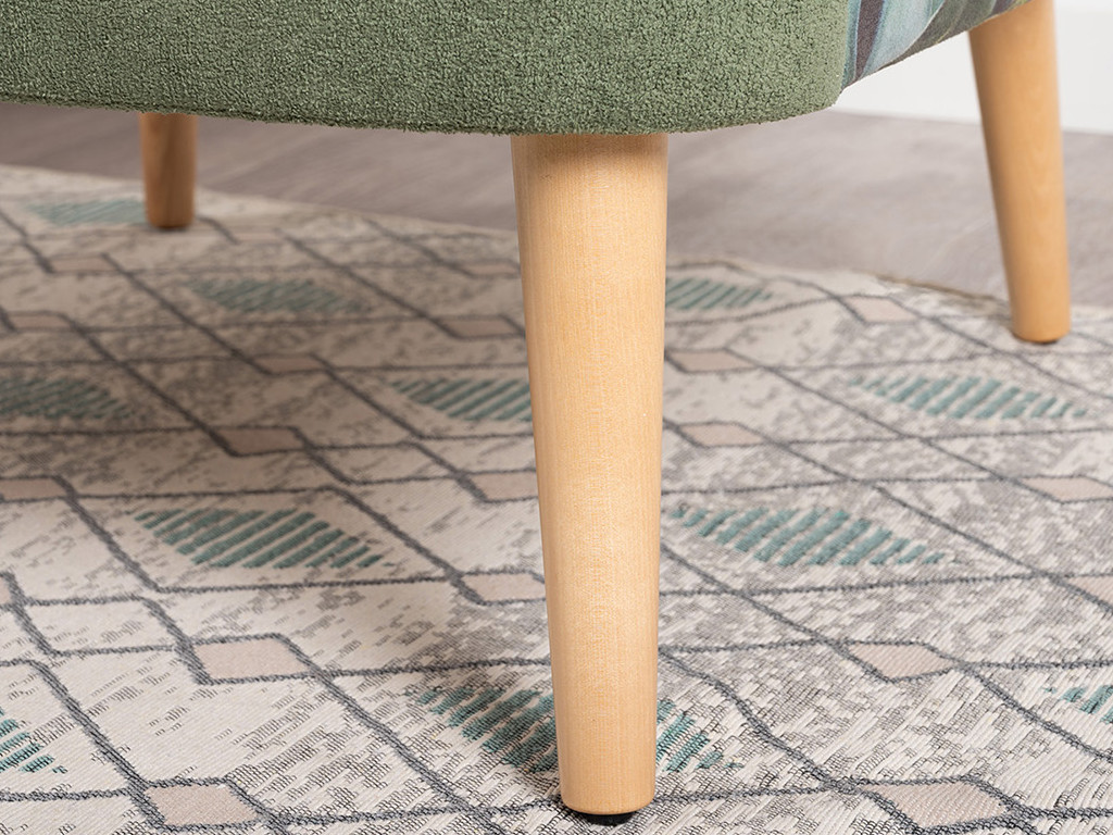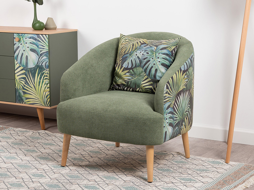 Кресло для отдыха на деревянных опорах. Спинка округлой формы переходящая в боковины. Кресло с подушкой думкой квадратной форы из ткани компаньон.