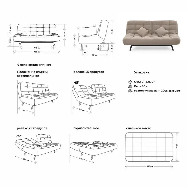 Встроенный механизм «клик кляк» позволяет трансформировать диван в 3 положения:
