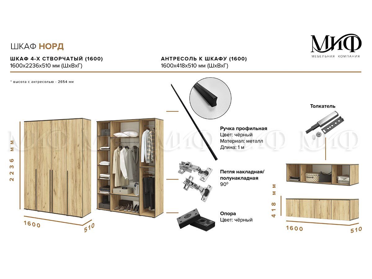 Шкаф четырехстворчатый Норд 1600 дуб крафт МГ