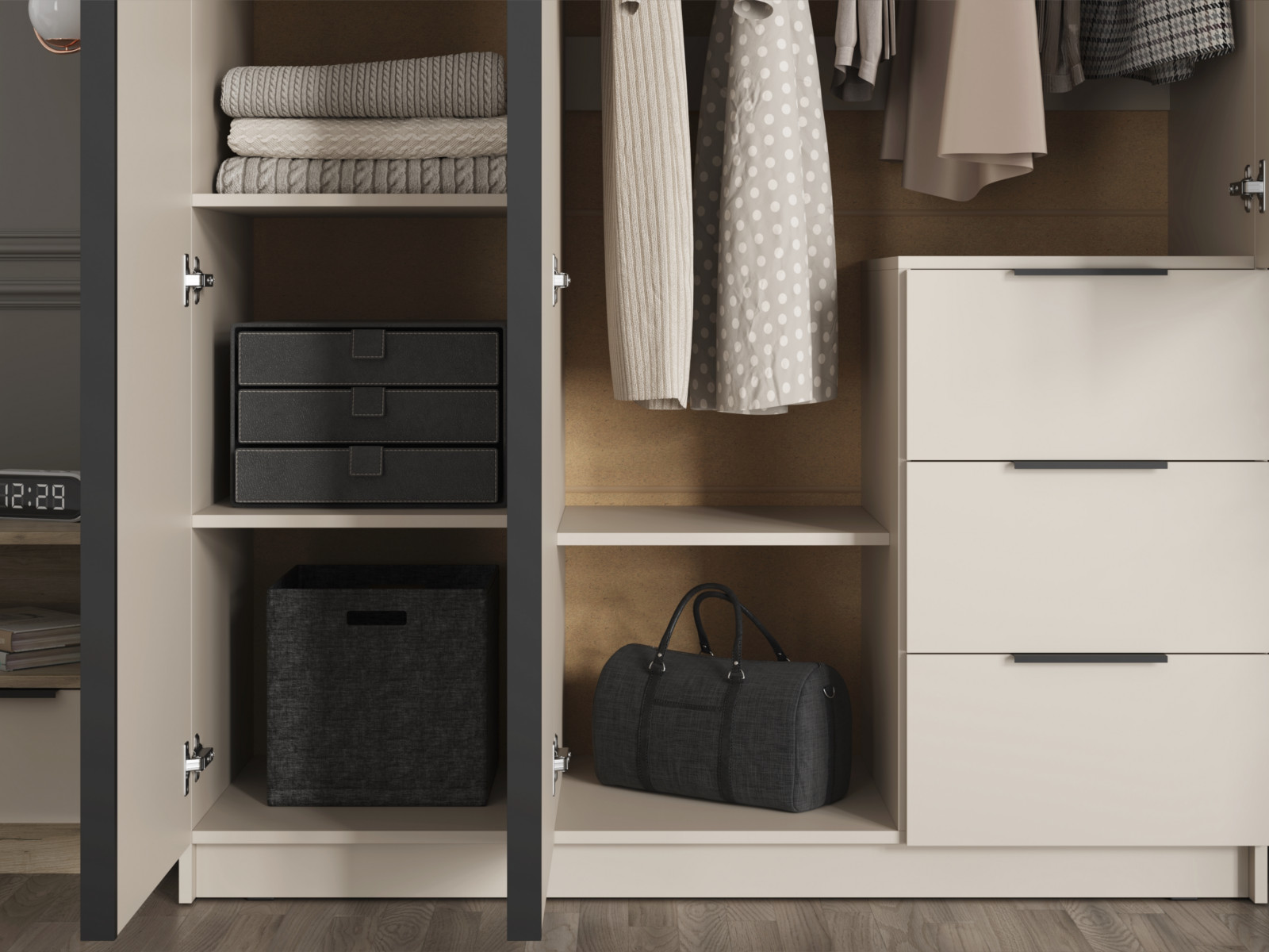 - Две левых створки и фасады ящиков имеют ручку – цвет чёрный, материал – пластик.