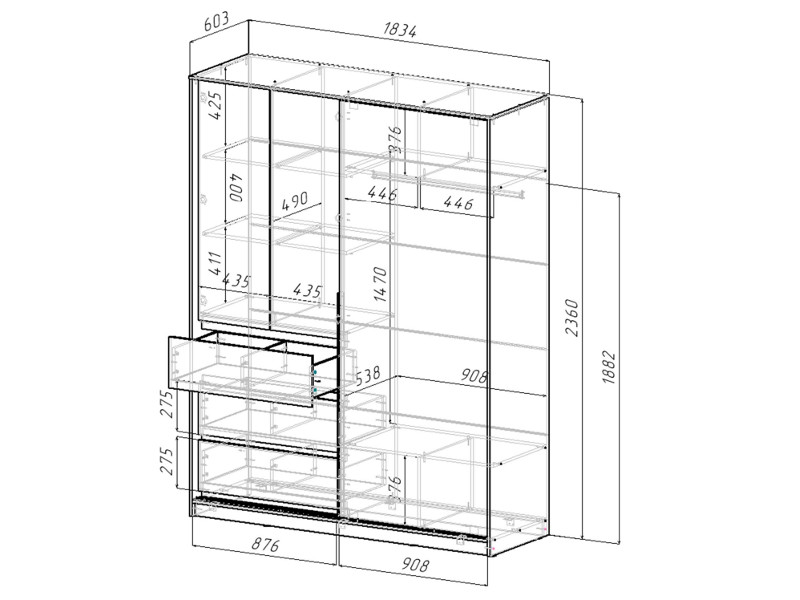 2) Отделение с ящиками и полками Д.876 х В.2254 х Г.538мм. По высоте отделение разделено на