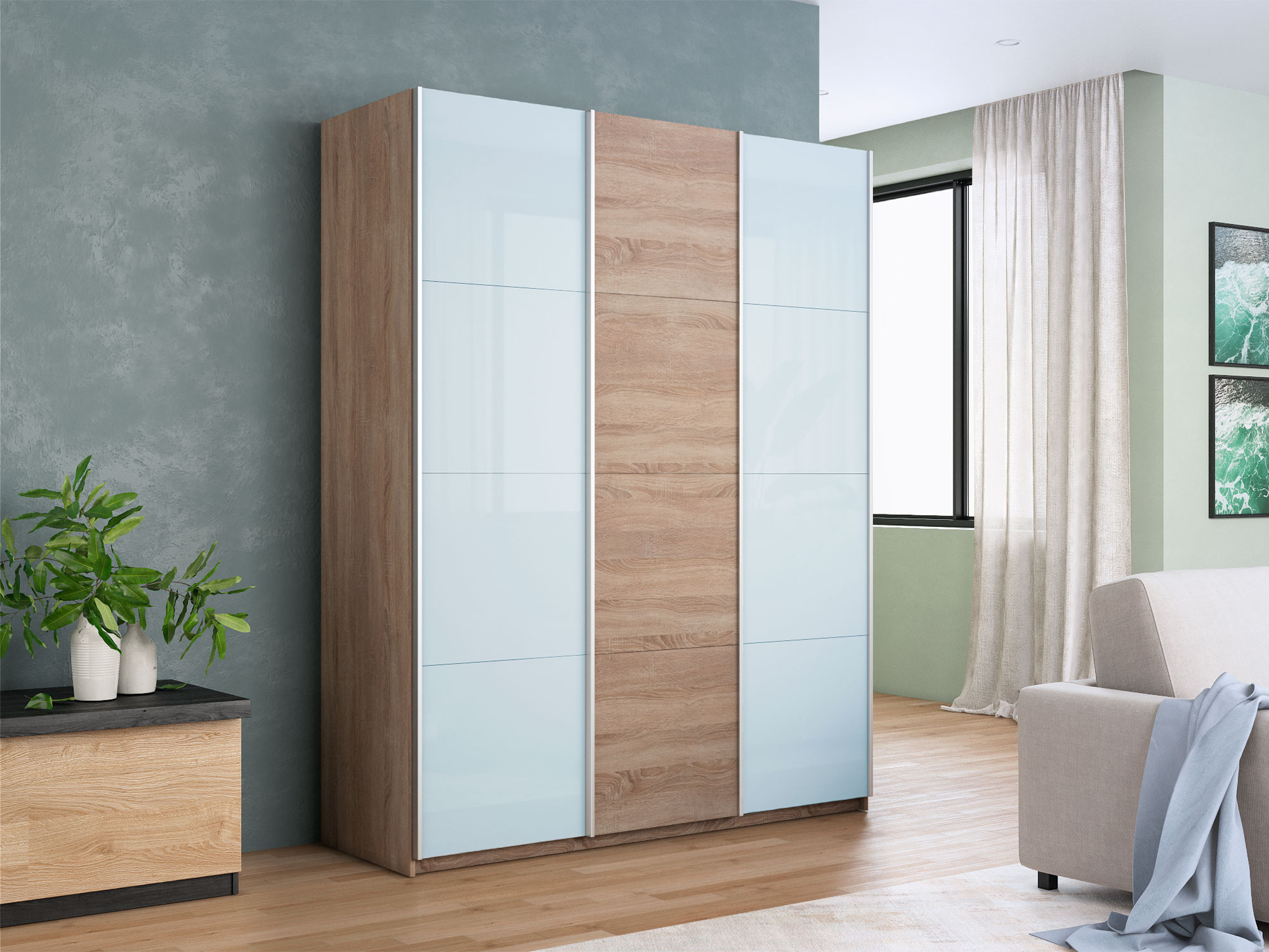 - Шкаф-купе Прайм 3-х дверный 1800 два Стекла Белые/ДСП Сонома