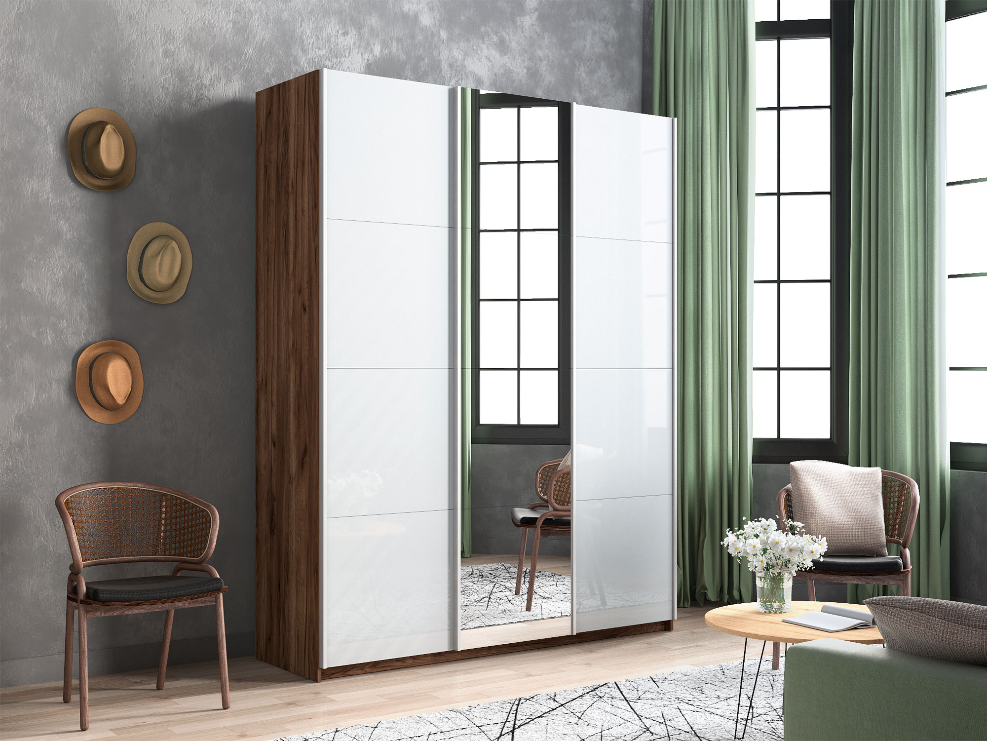 - Шкаф-купе Прайм 3-х дверный 2100 два Стекла Белые/Зеркало Крафт табачный