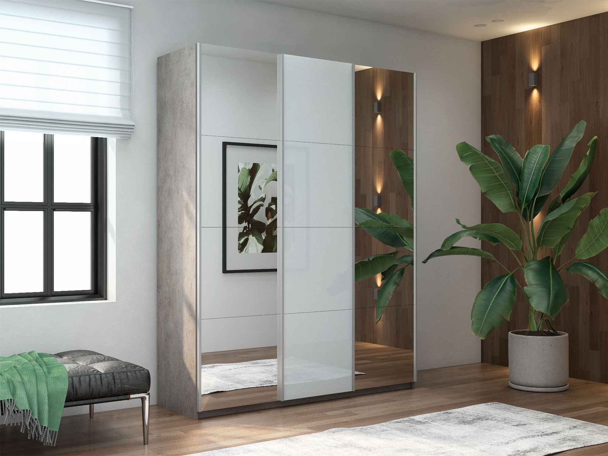 Шкаф-купе Прайм 3-х дверный 2100 Зеркало/Стекло Белое/Зеркало Бетон