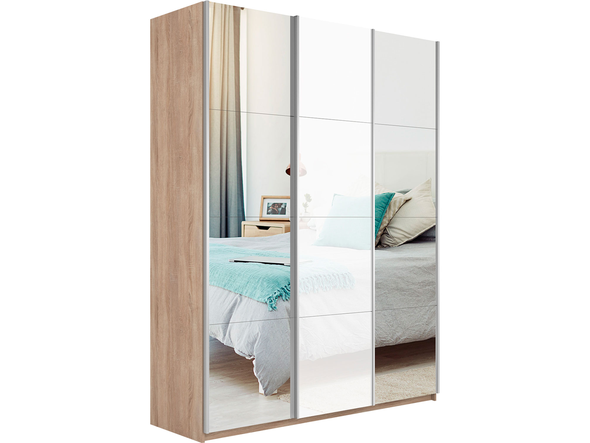 - Шкаф-купе Прайм 3-х дверный 2100 Зеркало/Стекло Белое/Зеркало Сонома
