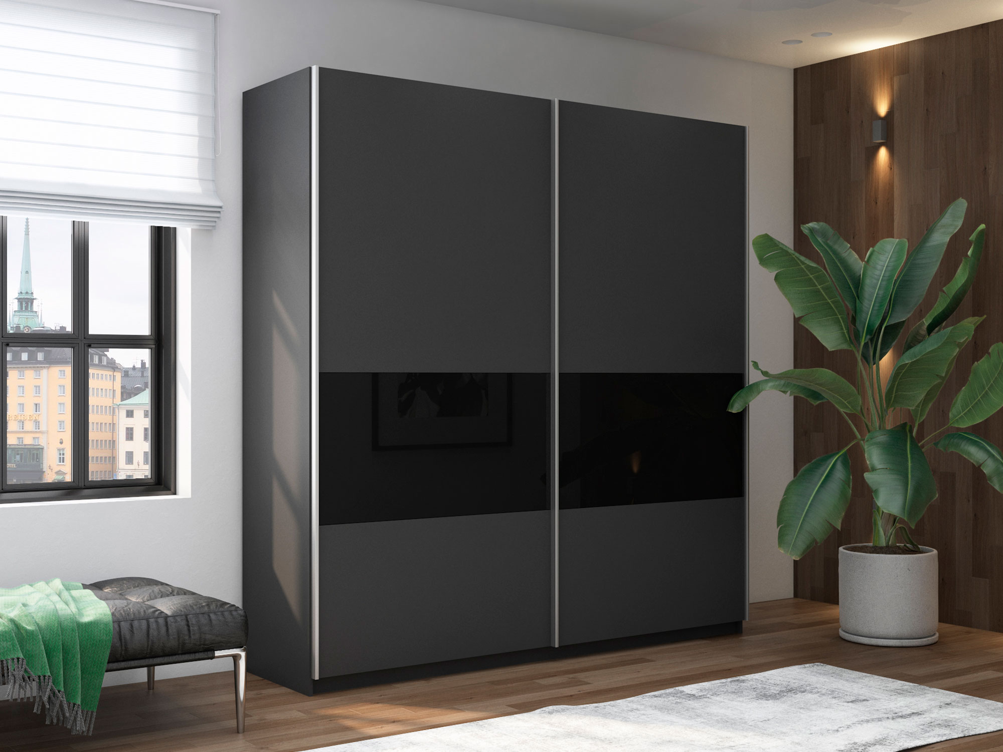 Шкаф-купе Прайм Широкий 2-х дверный ДСП/вставки Стекло Черное Серый Диамант