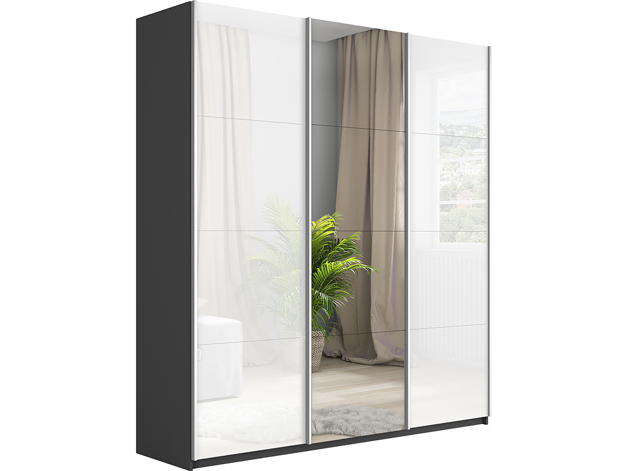 - Шкаф-купе Прайм Широкий 3-х дверный два белых стекла/зеркало Серый Диамант