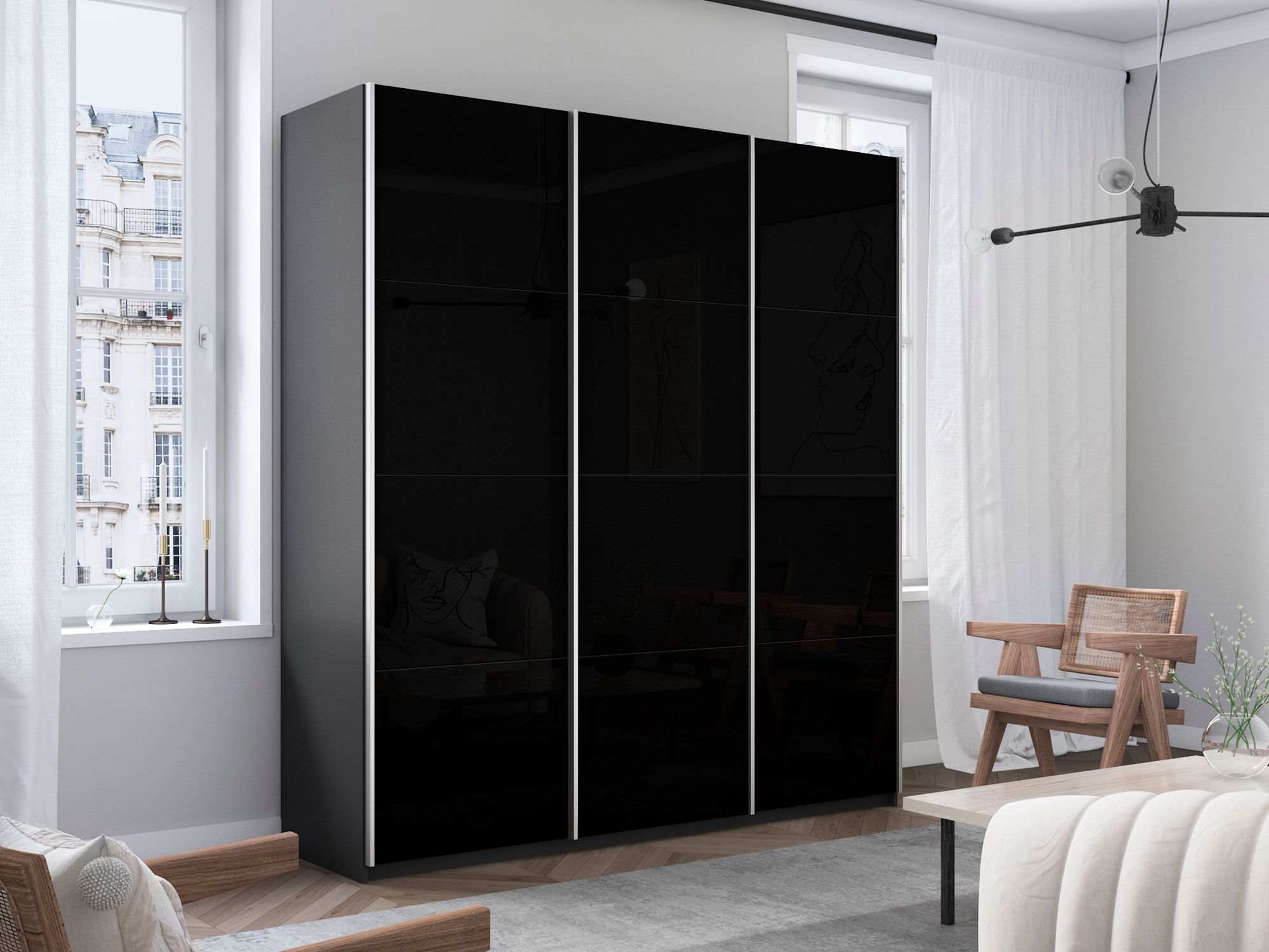 - Шкаф-купе Прайм Широкий 3-х дверный три черных стекла Серый Диамант